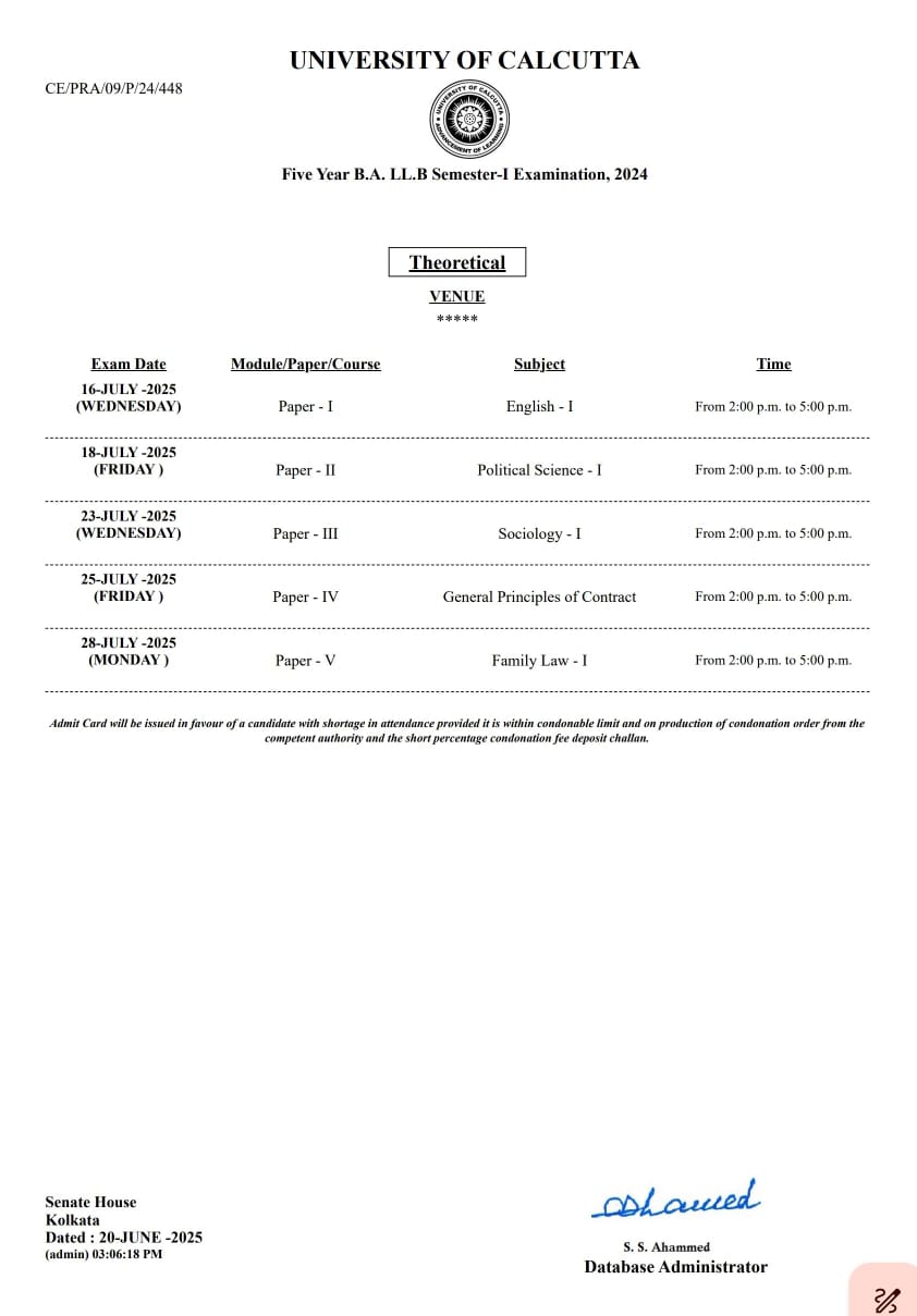 CU BA LLB SEMESTER 1 2025 EXAM SCHEDULE